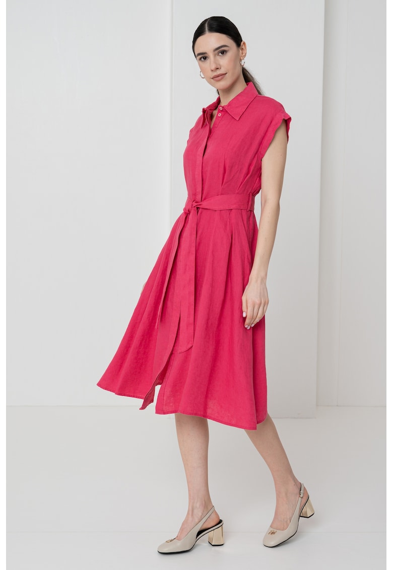 Caracteristici Culoare: fucsia Stil: casual Material: in Imprimeu: uni Croiala: evazat Lungime: midi Guler: ascutit Lungime maneca: maneca scurta Talie: talie prevazuta cu snur Buzunare: laterale Sistem inchidere: nasturi Compozitie Exterior: 100% in Info model Modelul poarta un produs de marimea S. Marimi model: 177 cm inaltime