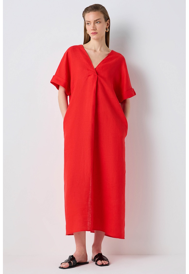 Caracteristici Culoare: rosu Stil: casual Material: in Imprimeu: uni Croiala: dreapta Lungime: midi Decolteu: in v Maneci: pliabile Lungime maneca: maneca scurta Buzunare: in cusaturile laterale Detalii: slit pe partea din spate Sistem inchidere: fara inchidere Compozitie Exterior: 100% in