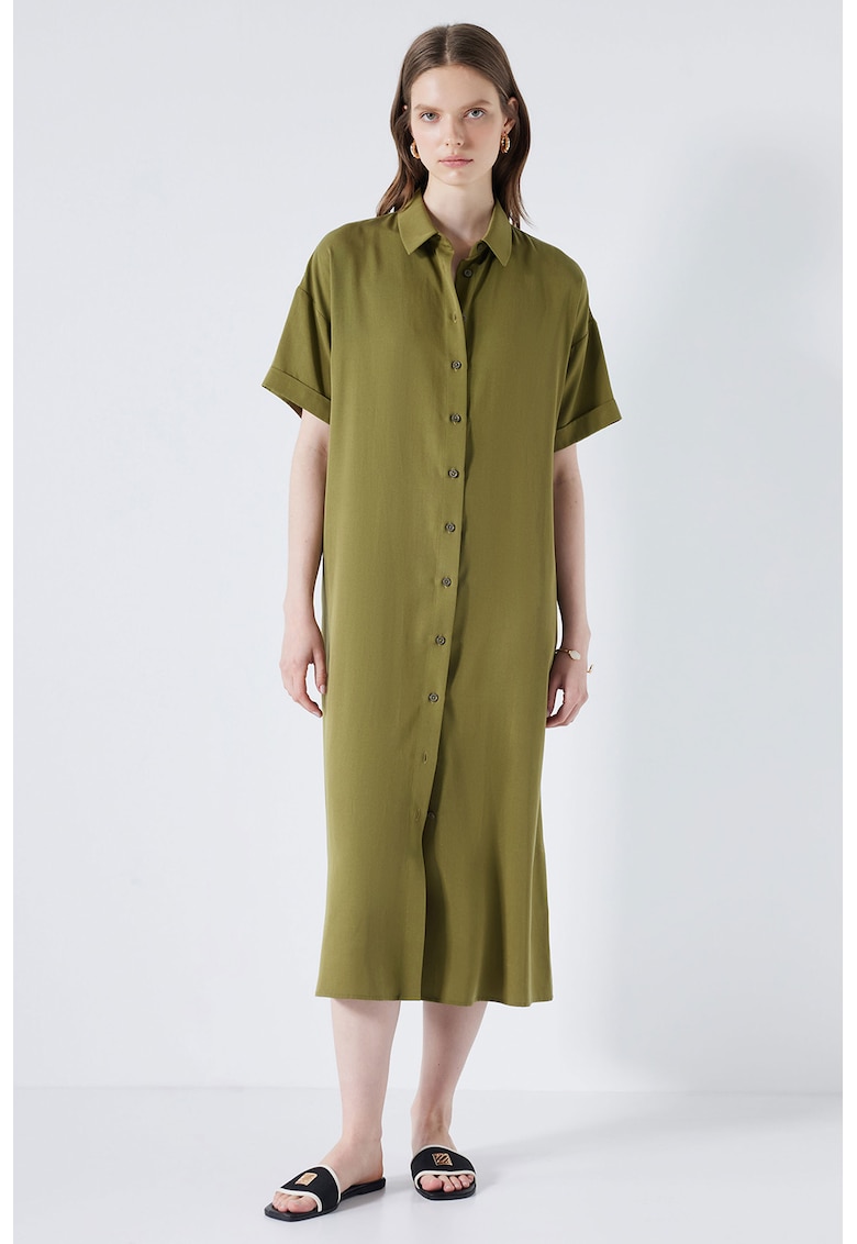 Caracteristici Culoare: verde masliniu Stil: casual Material: lyocell Imprimeu: uni Croiala: dreapta Lungime: midi Guler: ascutit Maneci: cazute