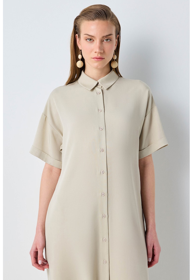 Caracteristici Culoare: maro nisip Stil: casual Material: lyocell Imprimeu: uni Croiala: dreapta Lungime: midi Guler: ascutit Maneci: cazute