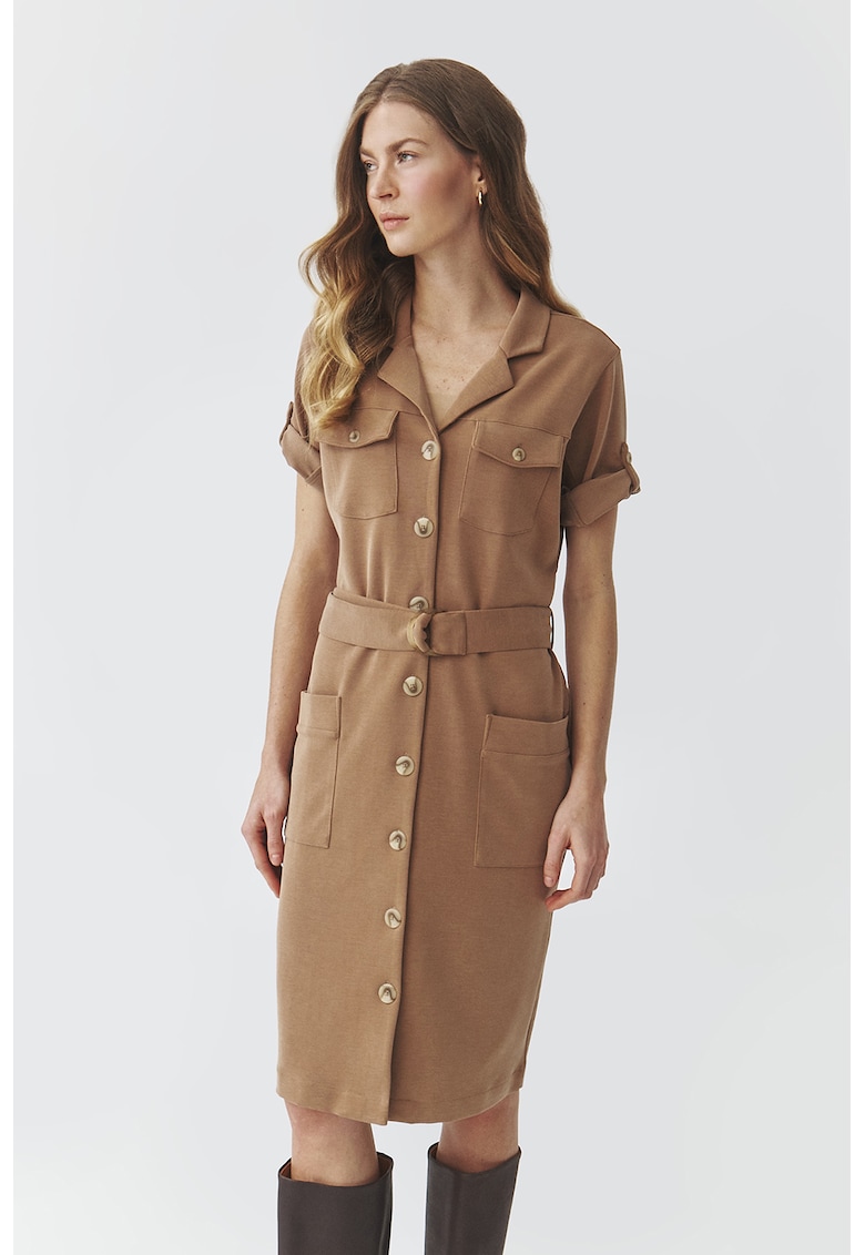 - modal Imprimeu: uni Croiala: dreapta Lungime: midi Decolteu: in v Lungime maneca: maneca scurta Buzunare: 2 pe partea din fata Sistem inchidere: nasturi Compozitie Exterior: 50% modal
