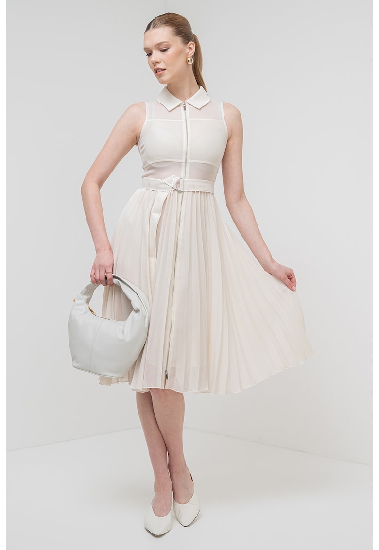 - viscoza Imprimeu: uni Croiala: evazat Lungime: midi Guler: clasic Lungime maneca: fara maneca Sistem inchidere: fermoar Compozitie Exterior: 51% viscoza