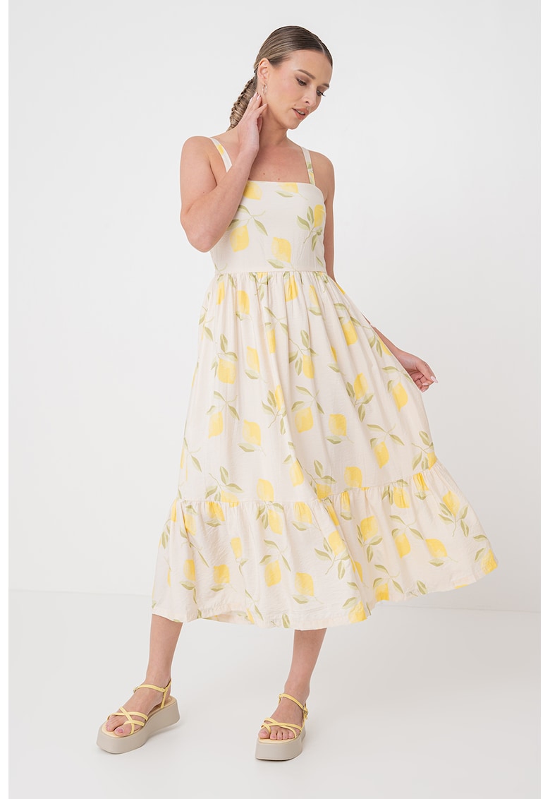 - nylon Imprimeu: fructe Croiala: evazat Lungime: midi Decolteu: patrat Lungime maneca: fara maneca Compozitie Exterior: 85% viscoza