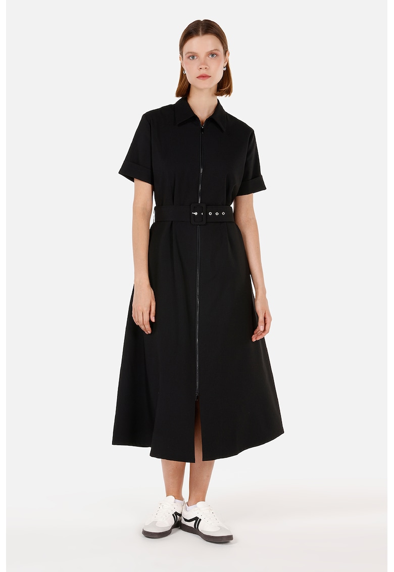 - elastan Imprimeu: uni Croiala: evazat Lungime: midi Guler: clasic Lungime maneca: maneca scurta Sistem inchidere: fermoar Compozitie Exterior: 80% poliester