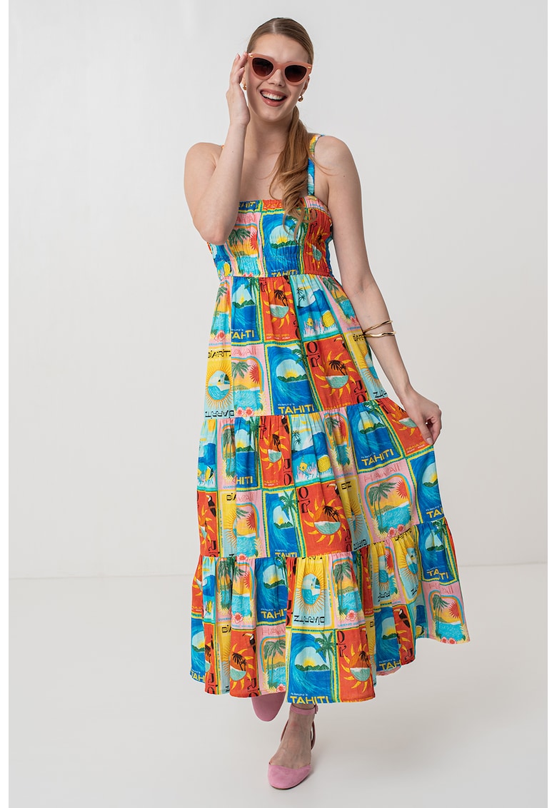 - viscoza Imprimeu: grafic Croiala: evazat Lungime: midi Decolteu: patrat Lungime maneca: fara maneca Sistem inchidere: fara inchidere Compozitie Exterior: 60% bumbac