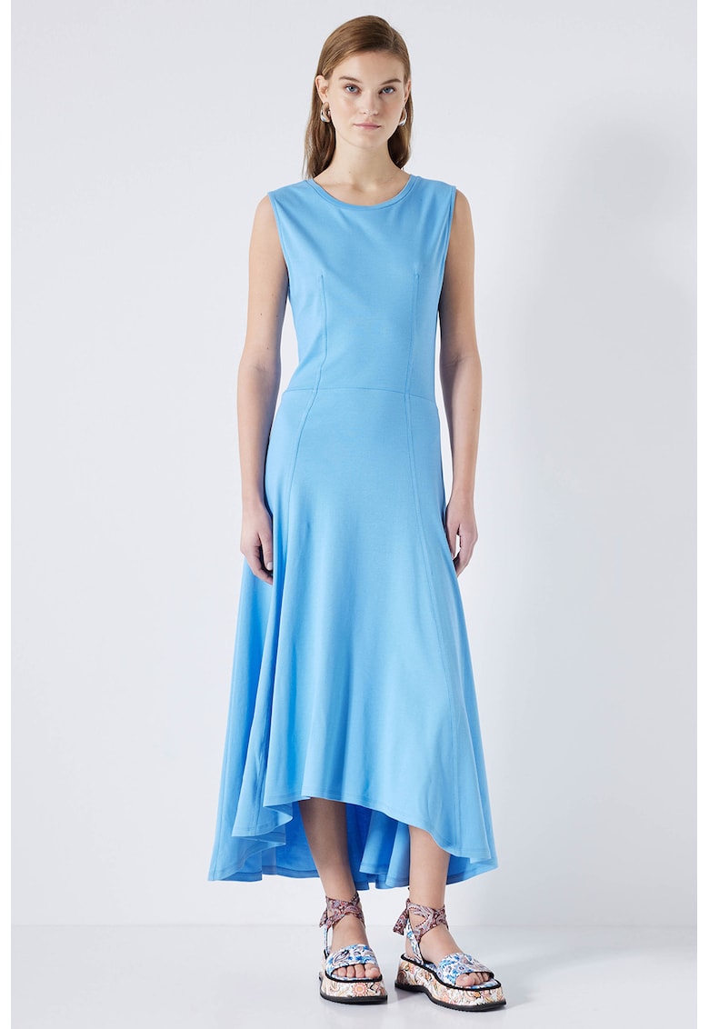 Caracteristici Culoare: albastru glaciar Stil: elegant Material: bumbac Imprimeu: uni Croiala: evazat Lungime: midi Decolteu: rotund Lungime maneca: fara maneca Detalii: terminatie asimetrica Sistem inchidere: fara inchidere Compozitie Exterior: 100% bumbac