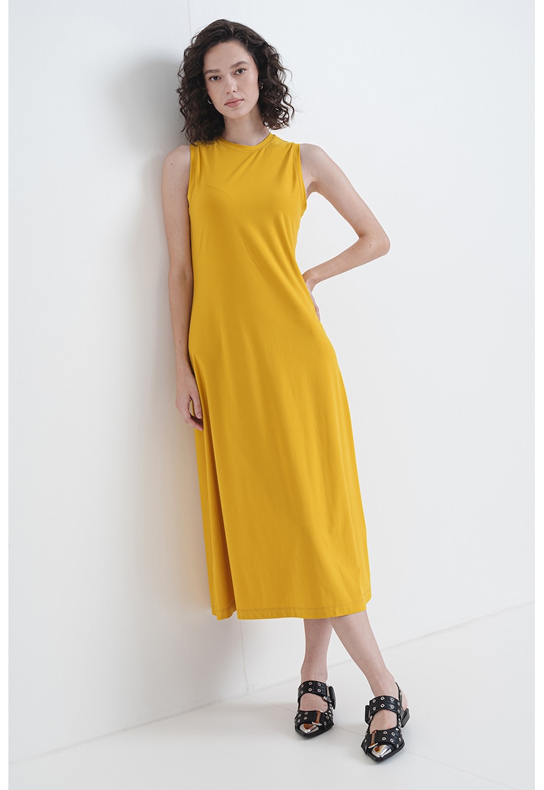 Caracteristici Culoare: galben sofran Stil: casual Material: bumbac Imprimeu: uni Croiala: evazat Lungime: midi Decolteu: la baza gatului Lungime maneca: fara maneca Sistem inchidere: fara inchidere Compozitie Exterior: 93% bumbac