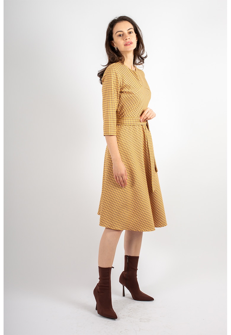 - ocru Stil: casual Material: sintetic Imprimeu: carouri Croiala: evazat Lungime: midi Decolteu: rotund cu decupaj in v Lungime maneca: maneca trei sferturi Detalii: snur in talie Compozitie Exterior: 62% bumbac