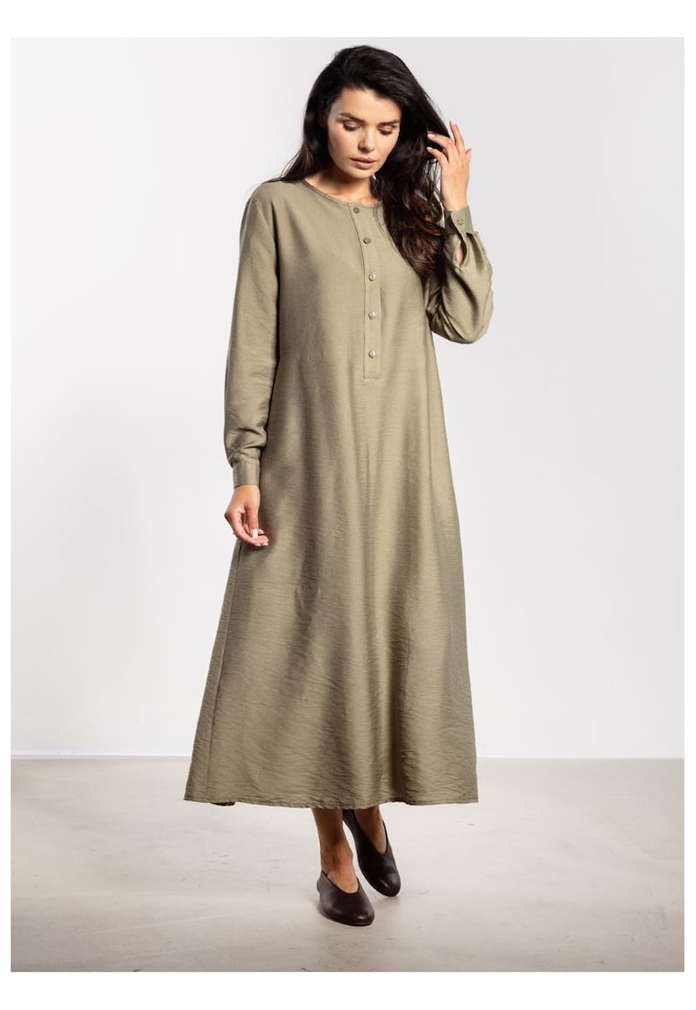 Caracteristici Culoare: kaki Stil: elegant Material: rayon Imprimeu: uni Croiala: lejer Lungime: midi Decolteu: rotund Maneci: mansete cu nasturi Lungime maneca: maneca lunga Detalii: cordon detasabil in talie Sistem inchidere: nasturi Compozitie Exterior: 80% rayon