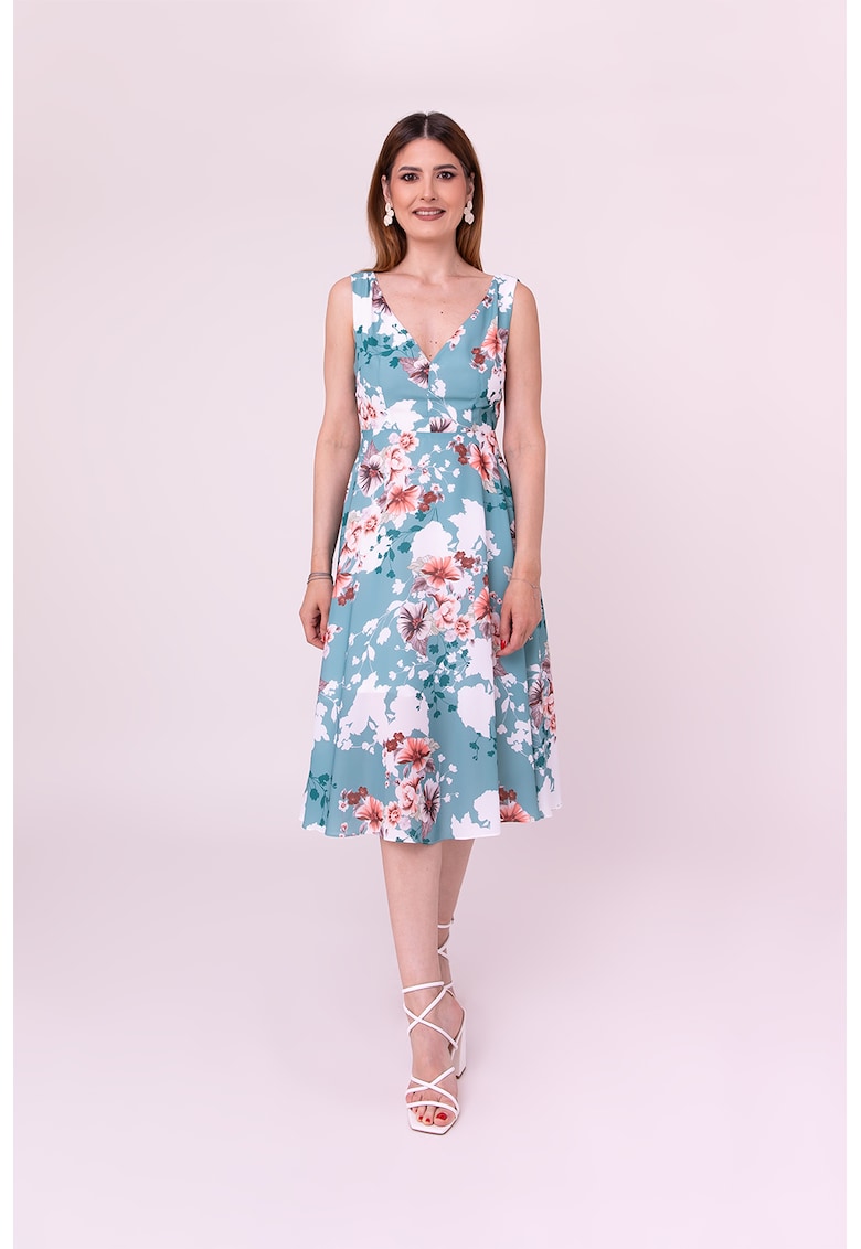 - viscoza Imprimeu: floral Croiala: evazat Lungime: midi Decolteu: in v Lungime maneca: fara maneca Sistem inchidere: fermoar Compozitie Exterior: 60% poliester