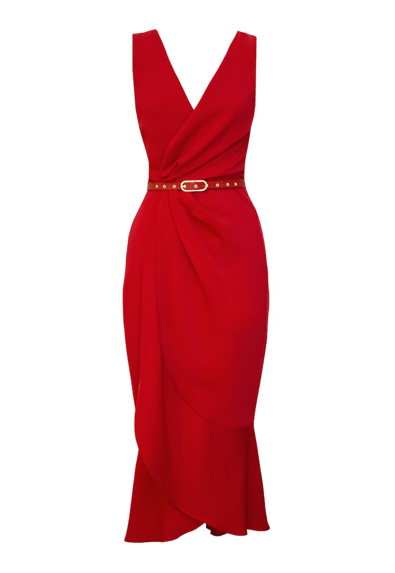 - sustenabil Imprimeu: uni Croiala: petrecuta Lungime: midi Decolteu: cache-coeur Lungime maneca: fara maneca Detalii: terminatie asimetrica