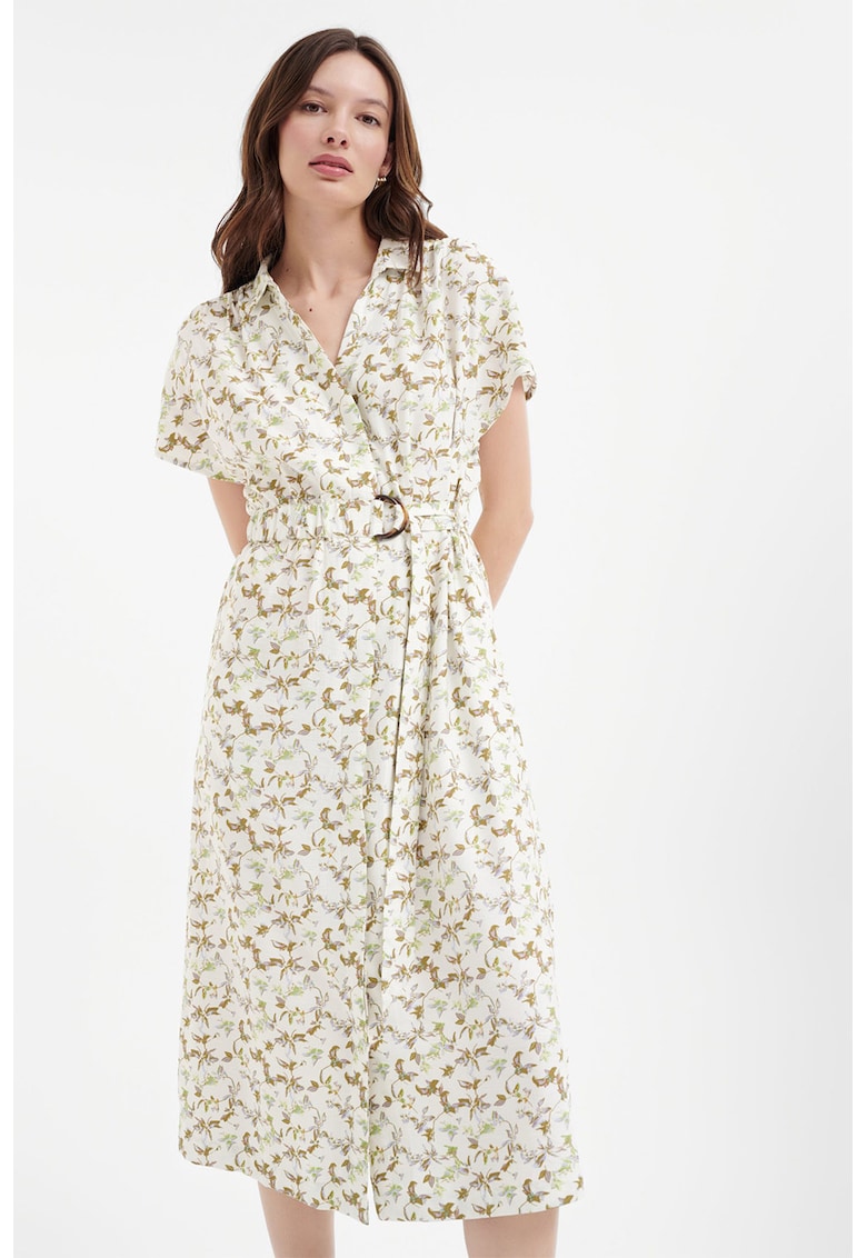 - viscoza Imprimeu: floral Croiala: petrecuta Lungime: midi Decolteu: in v Lungime maneca: maneca scurta Talie: curea Sistem inchidere: catarama Compozitie Exterior: 85% viscoza