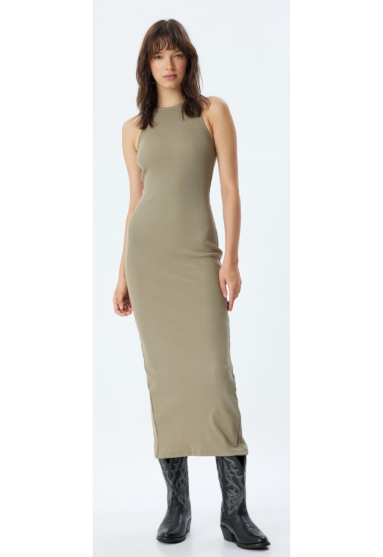 Caracteristici Culoare: kaki Stil: casual Material: bumbac Imprimeu: uni Croiala: dreapta Lungime: midi Decolteu: la baza gatului Lungime maneca: fara maneca Detalii: aspect striat Sistem inchidere: fara inchidere Compozitie Exterior: bumbac