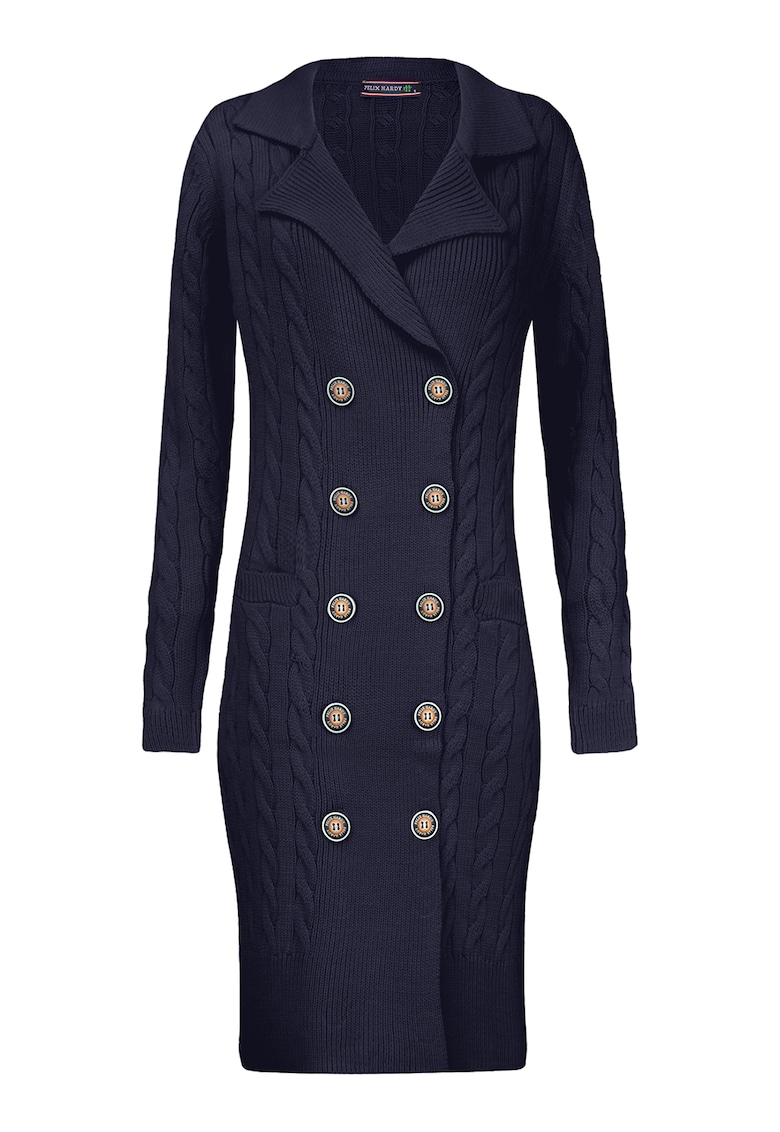 - tricot Imprimeu: uni Croiala: bodycon Lungime: midi Guler: cu revere Lungime maneca: maneca lunga Buzunare: frontale Detalii: doua randuri de nasturi