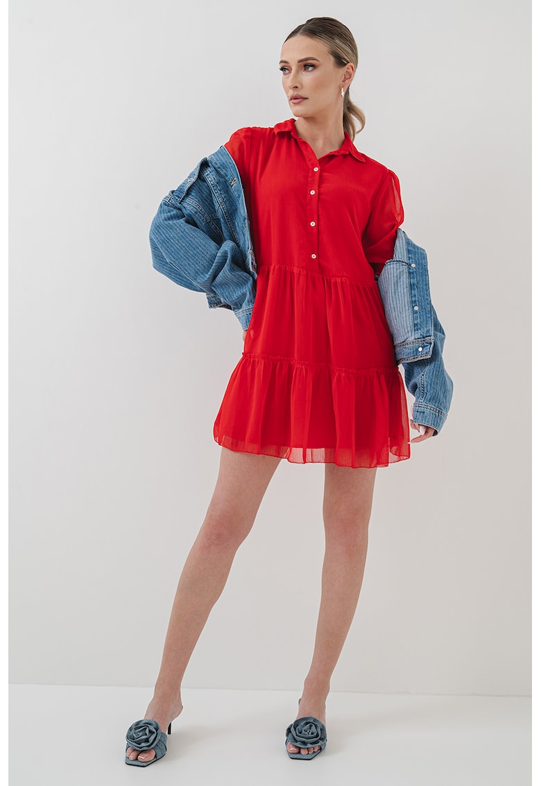 Caracteristici Culoare: rosu capsuna Stil: casual Material: sintetic Imprimeu: uni Croiala: in a Lungime: scurta Guler: clasic Lungime maneca: maneca lunga Sistem inchidere: nasturi Compozitie Exterior: 100% poliester Info model Modelul poarta un produs de marimea S. Marimi model: 174 cm inaltime