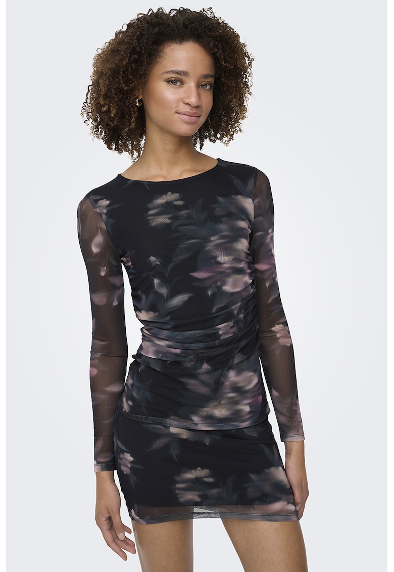 - lila Stil: casual Material: poliester Imprimeu: floral Croiala: cambrata Lungime: scurta Decolteu: rotund Maneci: semitransparente Lungime maneca: maneca lunga Detalii: detalii drapate Compozitie Exterior: 95% poliester reciclat