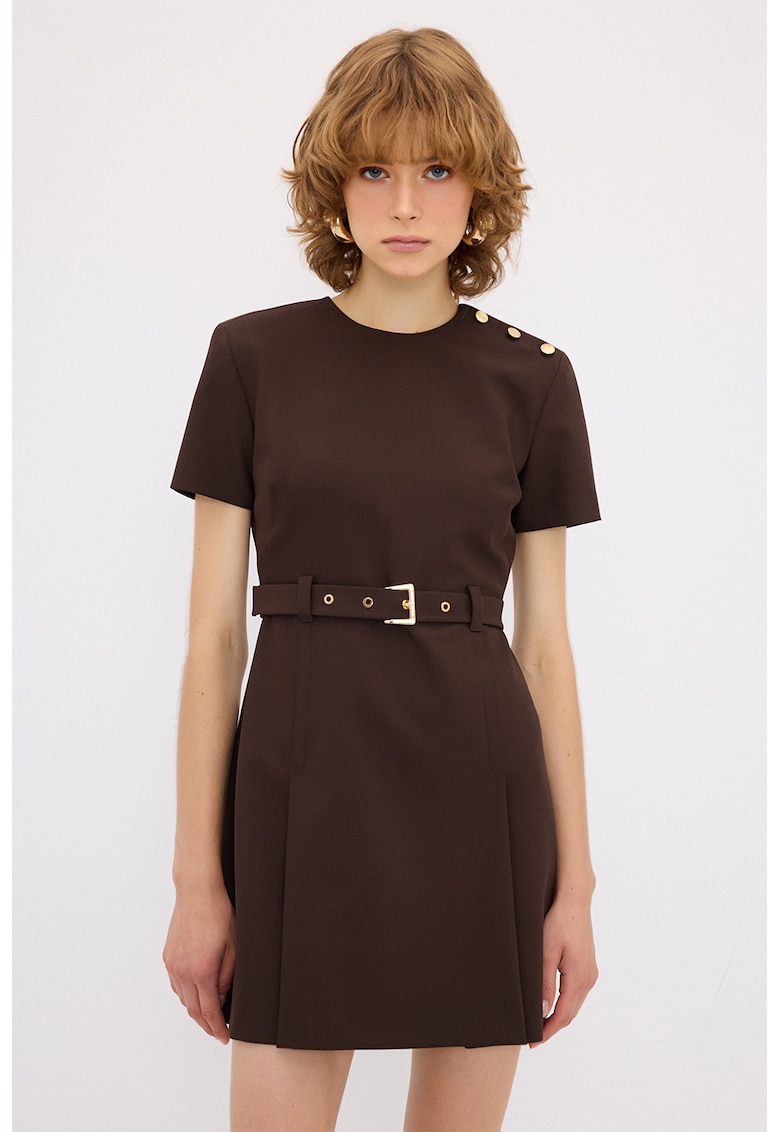 - viscoza Imprimeu: uni Croiala: in a Lungime: scurta Decolteu: la baza gatului Lungime maneca: maneca scurta Talie: curea Detalii: marimea este mai mica decat standardul