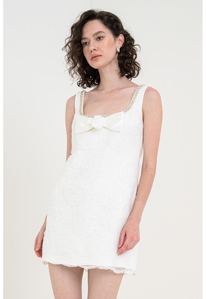 Caracteristici Culoare: alb murdar Stil: elegant Material: nylon Imprimeu: uni Croiala: dreapta Lungime: scurta Decolteu: patrat Barete: late Lungime maneca: fara maneca Detalii: dantela