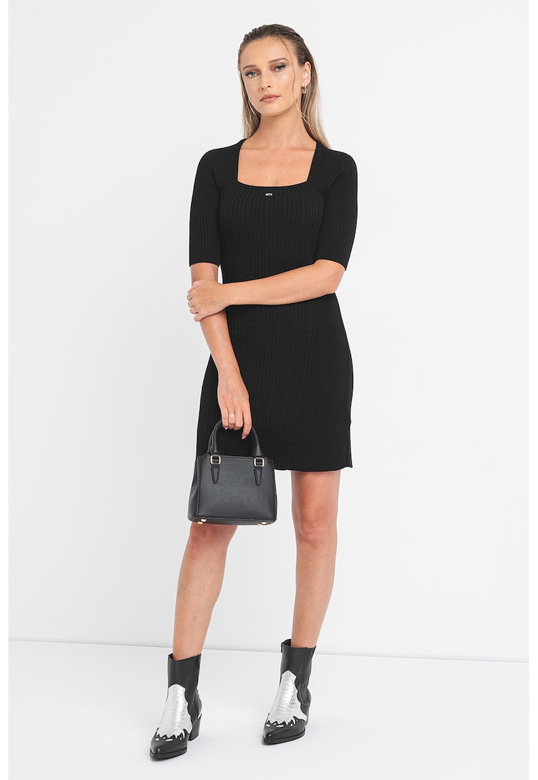 Caracteristici Culoare: negru Stil: casual Material: sintetic Imprimeu: uni Croiala: cambrata Lungime: scurta Decolteu: patrat Lungime maneca: maneca scurta Detalii: torsade discrete Sistem inchidere: fara inchidere Compozitie Exterior: 58% viscoza