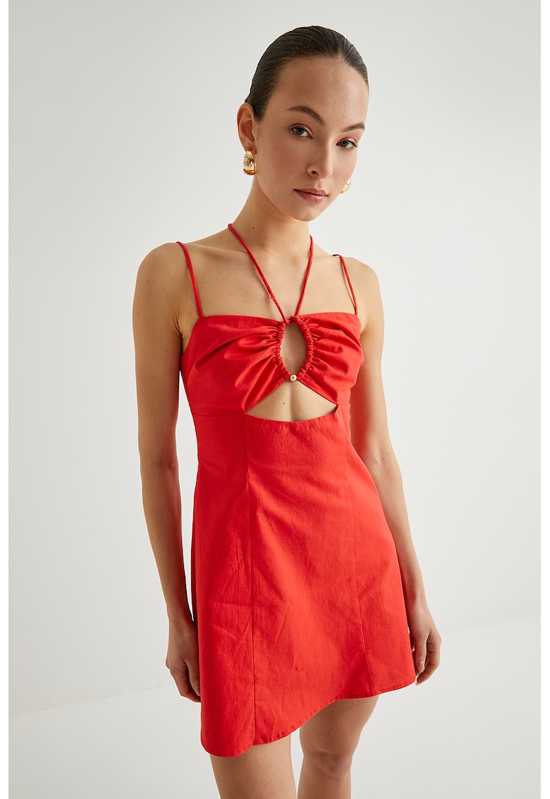 - in Imprimeu: uni Croiala: evazat Lungime: scurta Decolteu: drept Lungime maneca: fara maneca Detalii: decupaje Sistem inchidere: fermoar Compozitie Exterior: 52% in