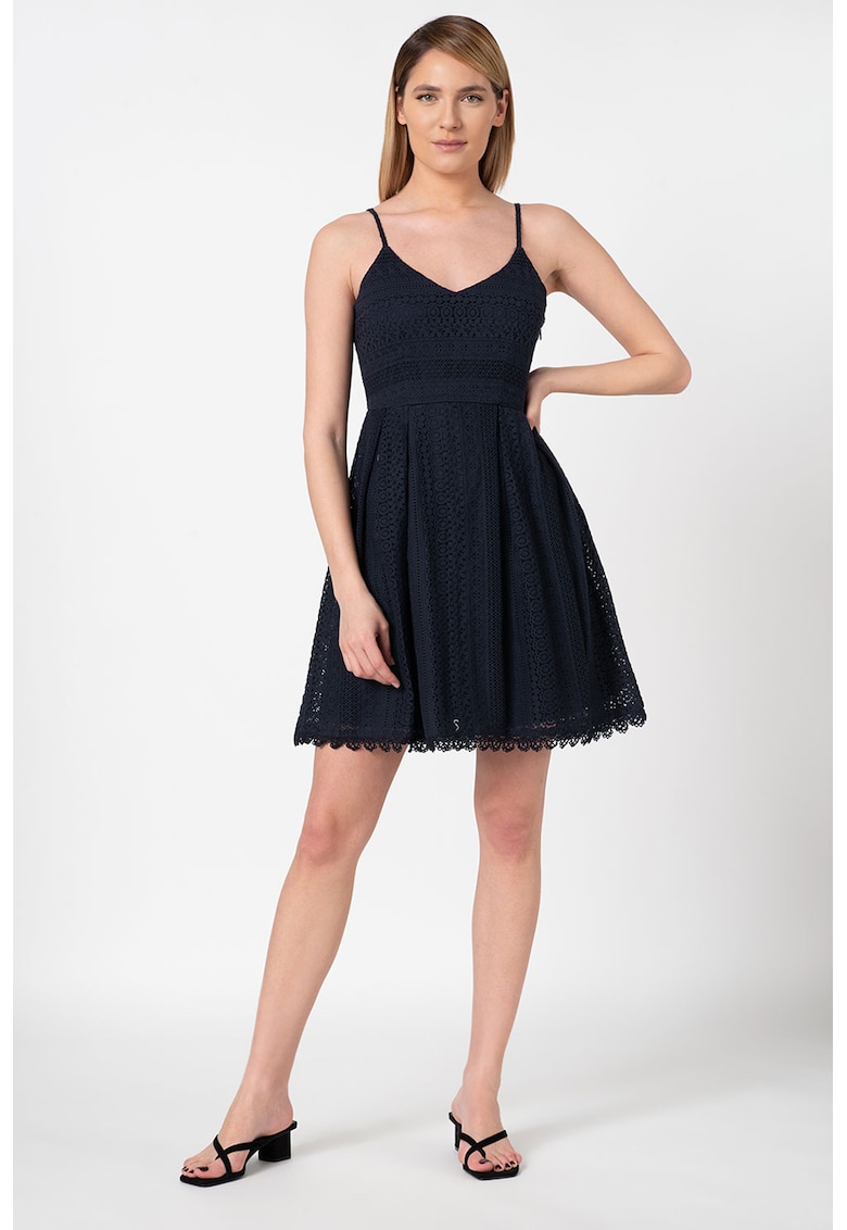 Caracteristici Culoare: bleumarin Stil: casual Material: dantela Imprimeu: uni Croiala: evazat Lungime: scurta Decolteu: in v Lungime maneca: fara maneca Talie: inalta Detalii: pliuri reversibile