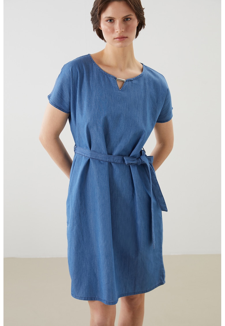 Caracteristici Culoare: albastru inchis Stil: casual Material: bumbac Imprimeu: uni Croiala: lejer Lungime: scurta Decolteu: rotund Lungime maneca: maneca scurta Talie: prevazuta cu snururi pentru ajustare Detalii: accesoriu metalic