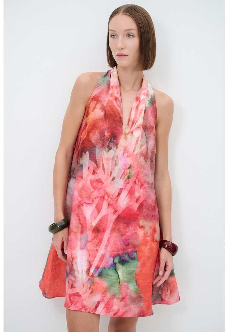 - verde deschis Stil: casual Material: in Imprimeu: floral Croiala: evazat Lungime: scurta Decolteu: in v Lungime maneca: fara maneca Detalii: marimea este mai mare decat standardul