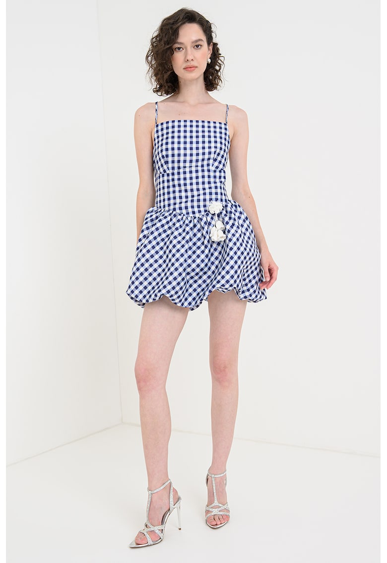- albastru inchis Stil: casual Material: poliester Imprimeu: carouri Croiala: evazat Lungime: scurta Decolteu: patrat Lungime maneca: fara maneca Detalii: aplicatie decorativa Compozitie Exterior: 100% poliester Info model Modelul poarta un produs de marimea S/8 UK. Marimi model: 177 cm inaltime