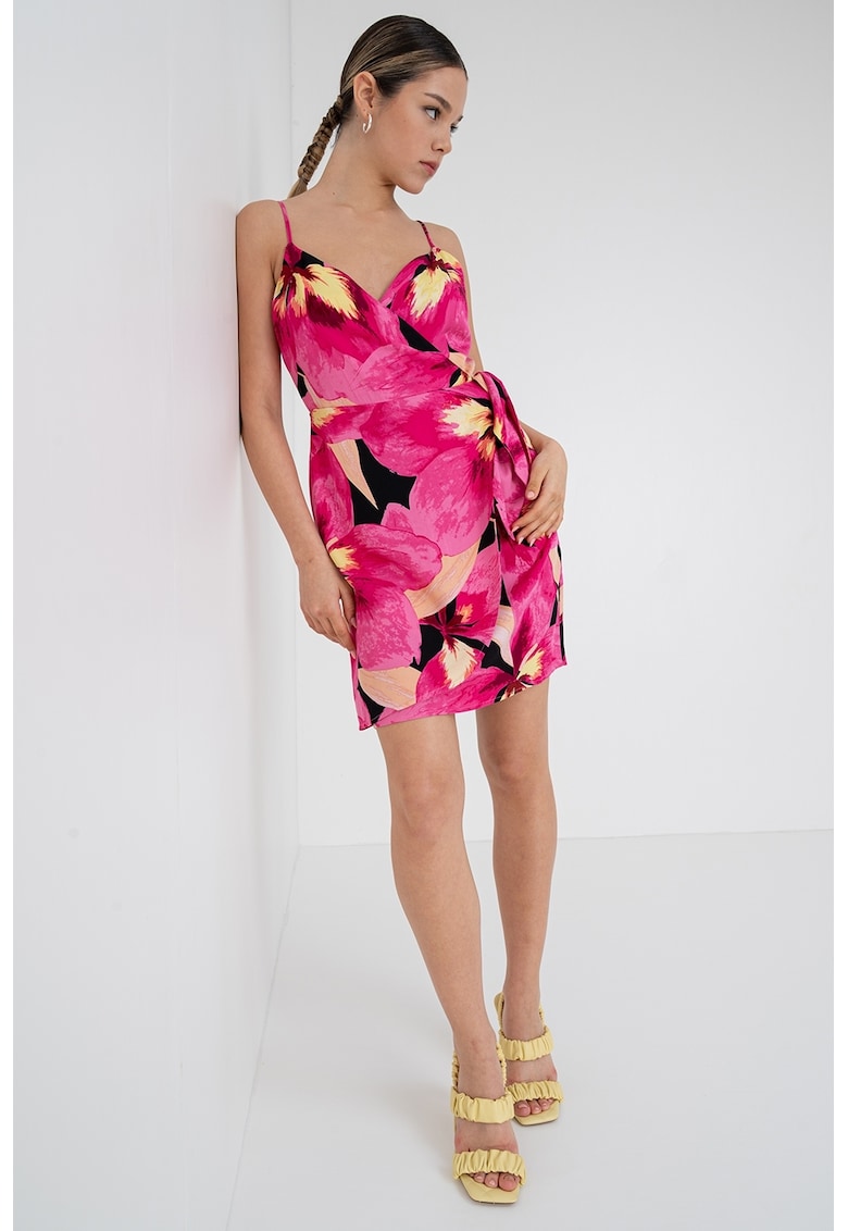 - roz Stil: casual Material: sintetic Imprimeu: tropical Croiala: petrecuta Lungime: scurta Decolteu: cache coeur Lungime maneca: fara maneca Sistem inchidere: cordon Compozitie Exterior: 100% viscoza lenzing™ecovero™ Info model Modelul poarta un produs de marimea S. Marimi model: 174 cm inaltime