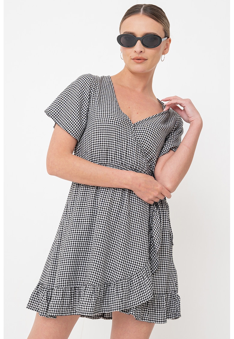 - negru Stil: casual Material: viscoza Imprimeu: carouri Croiala: petrecuta Lungime: scurta Decolteu: cache coeur Lungime maneca: maneca scurta Detalii: terminatie cu volane Sistem inchidere: cordon Compozitie Exterior: 100% viscoza Info model Modelul poarta un produs de marimea S. Marimi model: 174 cm inaltime
