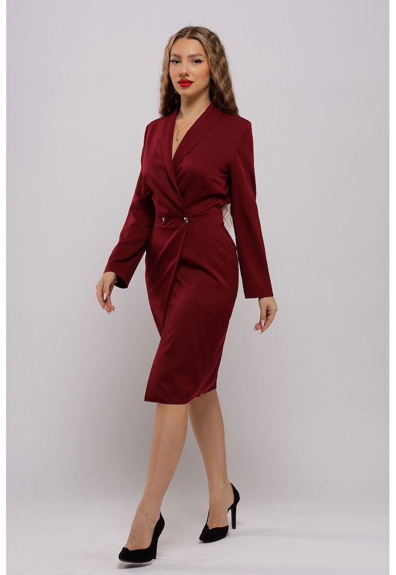 Caracteristici Culoare: visiniu Stil: casual Material: poliester Imprimeu: uni Croiala: cambrata Lungime: midi Decolteu: in v Guler: cu revere Lungime maneca: maneca lunga Buzunare: laterale Sistem inchidere: nasturi Compozitie Exterior: 95% poliester