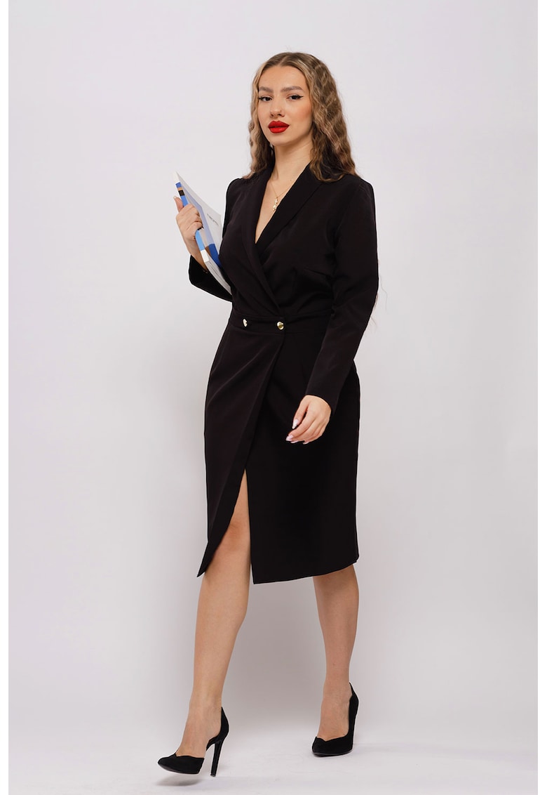 Caracteristici Culoare: negru Stil: casual Material: poliester Imprimeu: uni Croiala: cambrata Lungime: midi Decolteu: in v Guler: cu revere Lungime maneca: maneca lunga Buzunare: laterale Sistem inchidere: nasturi Compozitie Exterior: 95% poliester