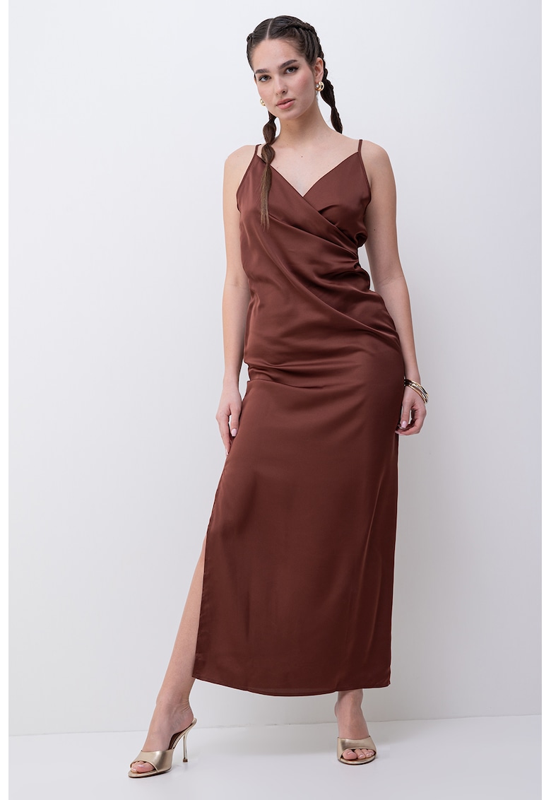 Caracteristici Culoare: maro fango Stil: casual Material: poliester Imprimeu: uni Croiala: dreapta Lungime: midi Decolteu: patrat Barete: inguste Lungime maneca: fara maneca Detalii: decolteu in v pe partea din spate