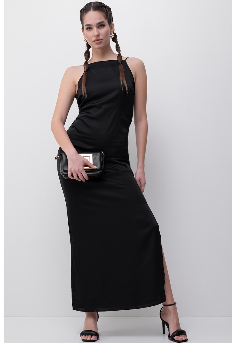Caracteristici Culoare: negru Stil: casual Material: poliester Imprimeu: uni Croiala: dreapta Lungime: midi Decolteu: patrat Barete: inguste Lungime maneca: fara maneca Detalii: decolteu in v pe partea din spate