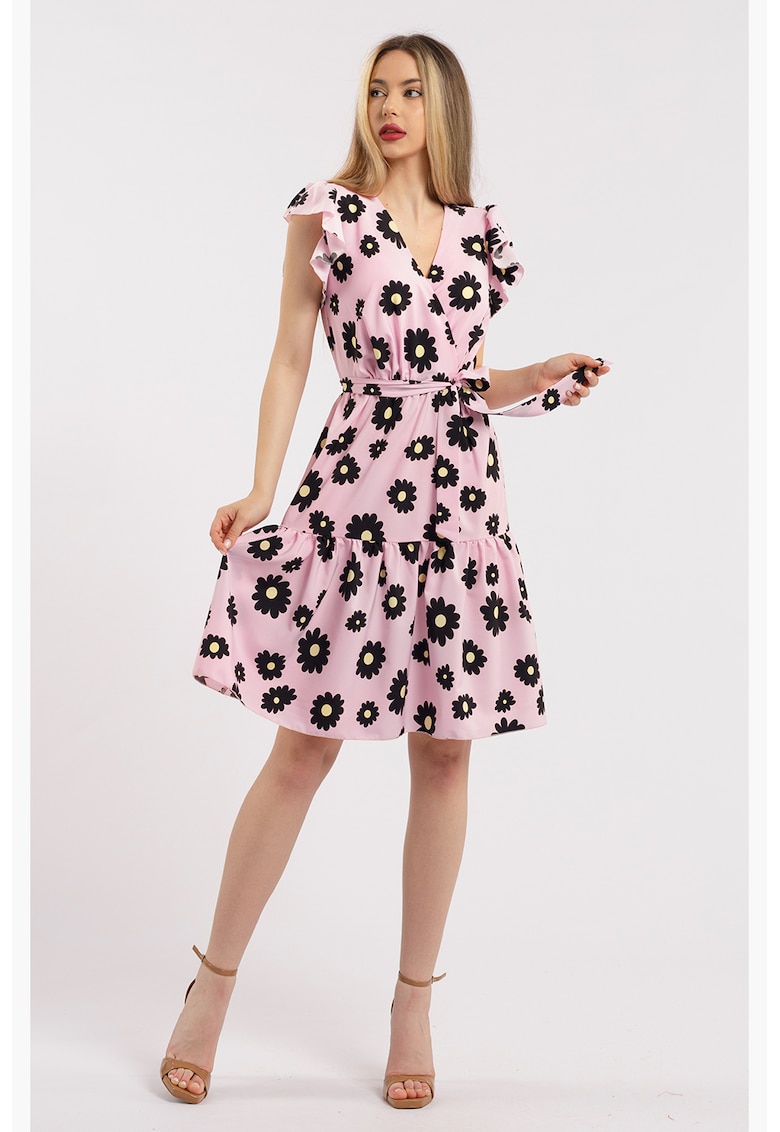- viscoza Imprimeu: floral Croiala: evazat Lungime: scurta Decolteu: in v Lungime maneca: maneca scurta Talie: talie prevazuta cu snur Compozitie Exterior: 60% viscoza