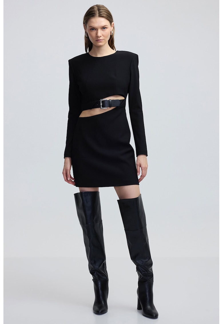 - poliamida Imprimeu: uni Croiala: cambrata Lungime: scurta Decolteu: rotund Lungime maneca: maneca lunga Detalii: curea