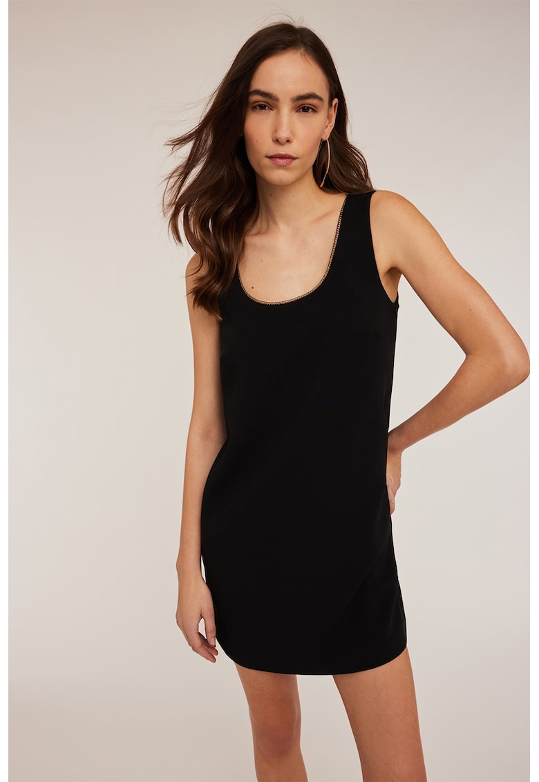 Caracteristici Culoare: negru Stil: casual Material: sintetic Imprimeu: uni Croiala: in a Lungime: scurta Decolteu: amplu Lungime maneca: fara maneca Detalii: detaliu din lant Sistem inchidere: fara inchidere Compozitie Exterior: 95% poliester