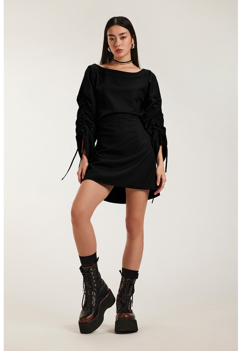 Caracteristici Culoare: negru Stil: casual Material: sintetic Imprimeu: uni Croiala: evazat Lungime: scurta Decolteu: barcuta Maneci: cu fronseuri Lungime maneca: maneca trei sferturi Detalii: decupaj pe partea din spate Compozitie Exterior: 63% polyester
