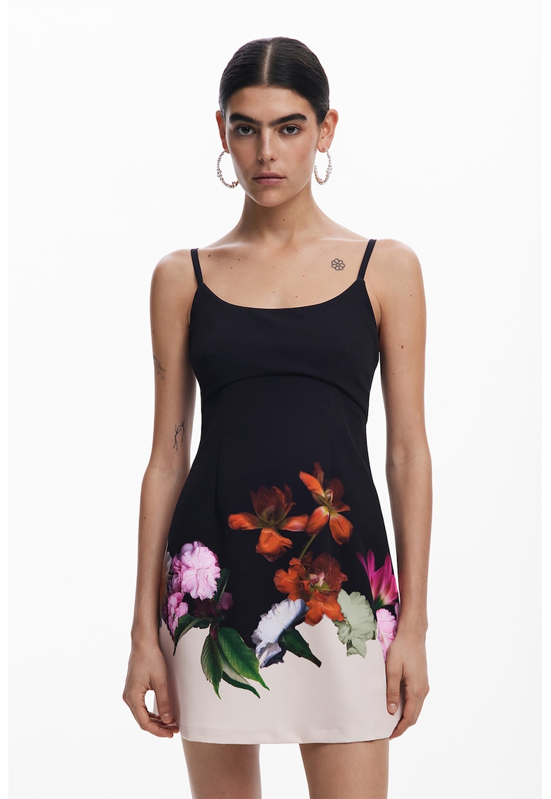 - portocaliu Stil: casual Material: poliester Imprimeu: floral Croiala: evazat Lungime: scurta Decolteu: rotund Lungime maneca: fara maneca Sistem inchidere: fara inchidere Compozitie Exterior: 92% poliester