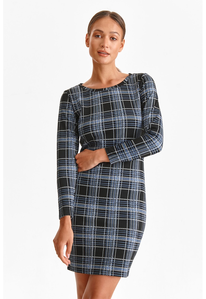 - elastan Imprimeu: carouri Croiala: bodycon Lungime: scurta Decolteu: rotund Lungime maneca: maneca lunga Compozitie Exterior: 52% poliester
