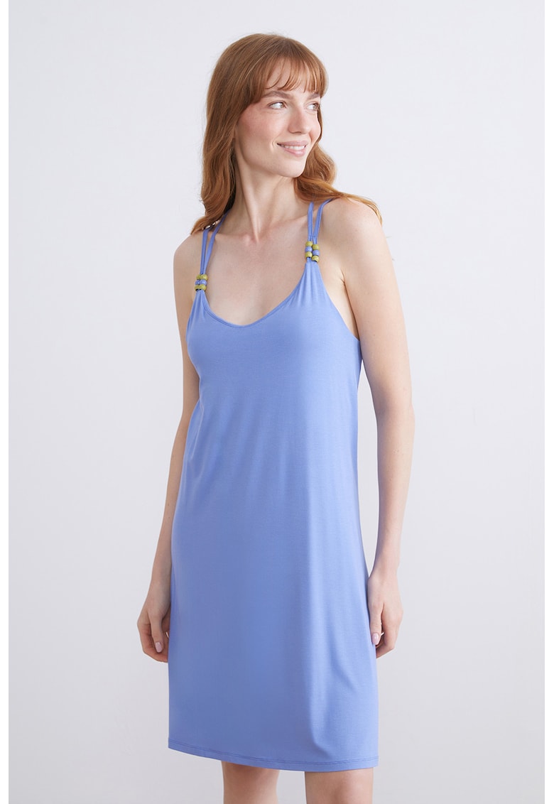 Caracteristici Culoare: albastru azur Stil: casual Material: viscoza Imprimeu: uni Croiala: lejer Lungime: scurta Decolteu: patrat Barete: inguste Lungime maneca: fara maneca Sistem inchidere: fara inchidere Compozitie Exterior: 97% viscoza