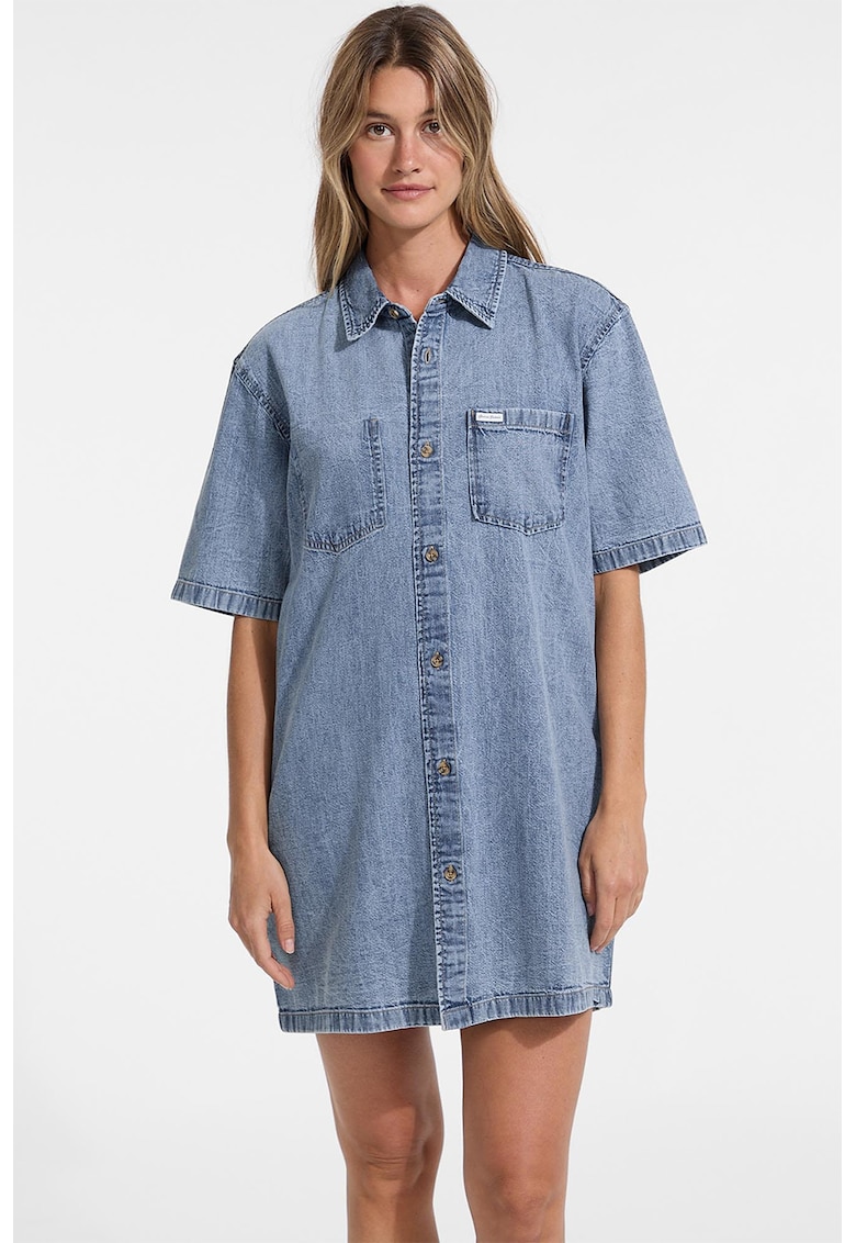 Caracteristici Culoare: albastru prafuit Stil: casual Material: denim Imprimeu: uni Croiala: dreapta Lungime: scurta Guler: ascutit Lungime maneca: maneca scurta Buzunare: 2 aplicate frontale Sistem inchidere: nasturi Compozitie Exterior: 100% bumbac