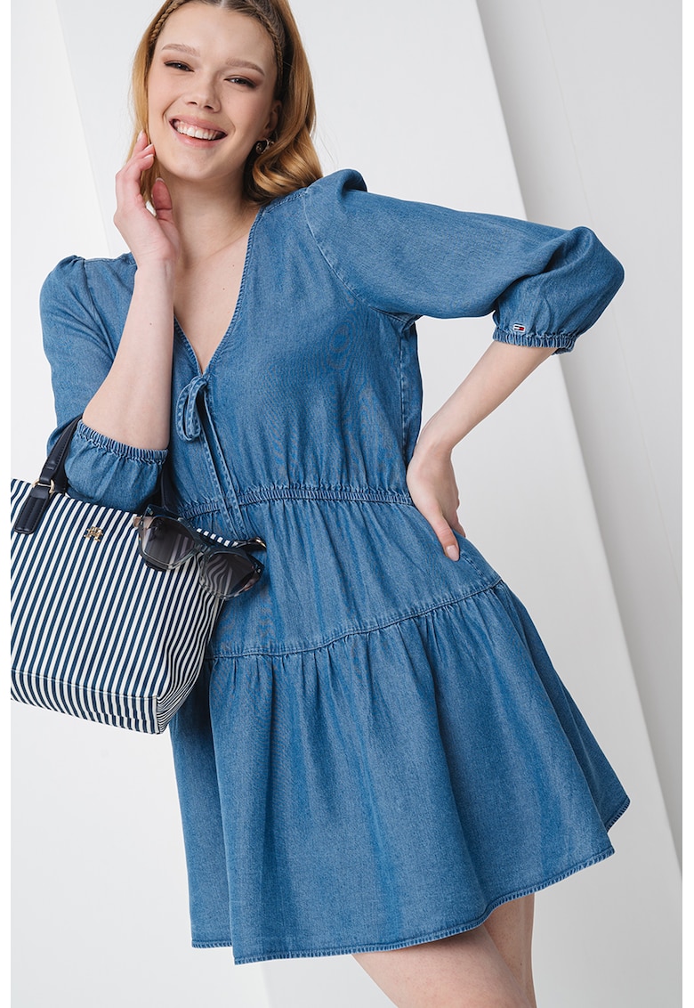Caracteristici Culoare: albastru deschis Stil: casual Material: lyocell Imprimeu: uni Croiala: evazat Lungime: scurta Decolteu: in v Lungime maneca: maneca medie Compozitie Exterior: 100% lyocell Info model Modelul poarta un produs de marimea S. Marimi model: 176 cm inaltime