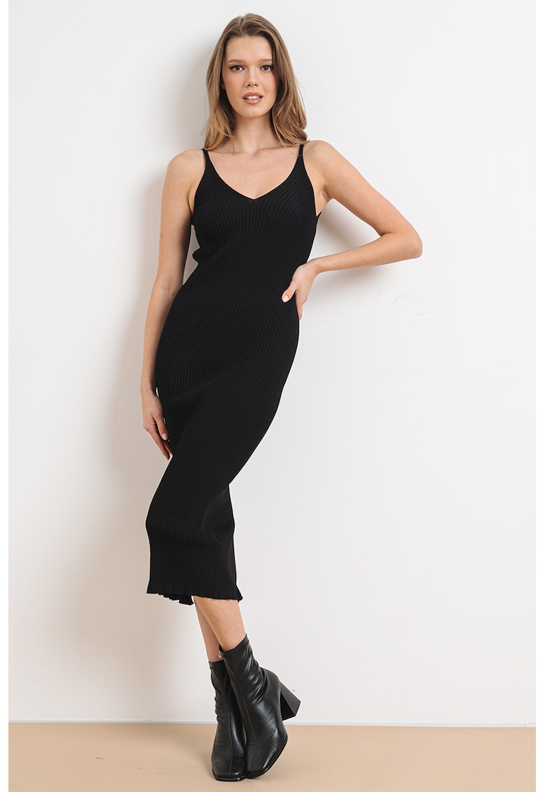 Caracteristici Culoare: negru Stil: casual Material: sintetic Imprimeu: uni Croiala: cambrata Lungime: midi Decolteu: in v Lungime maneca: fara maneca Detalii: slit pe partea din spate Sistem inchidere: fara inchidere Compozitie Exterior: 53% raion