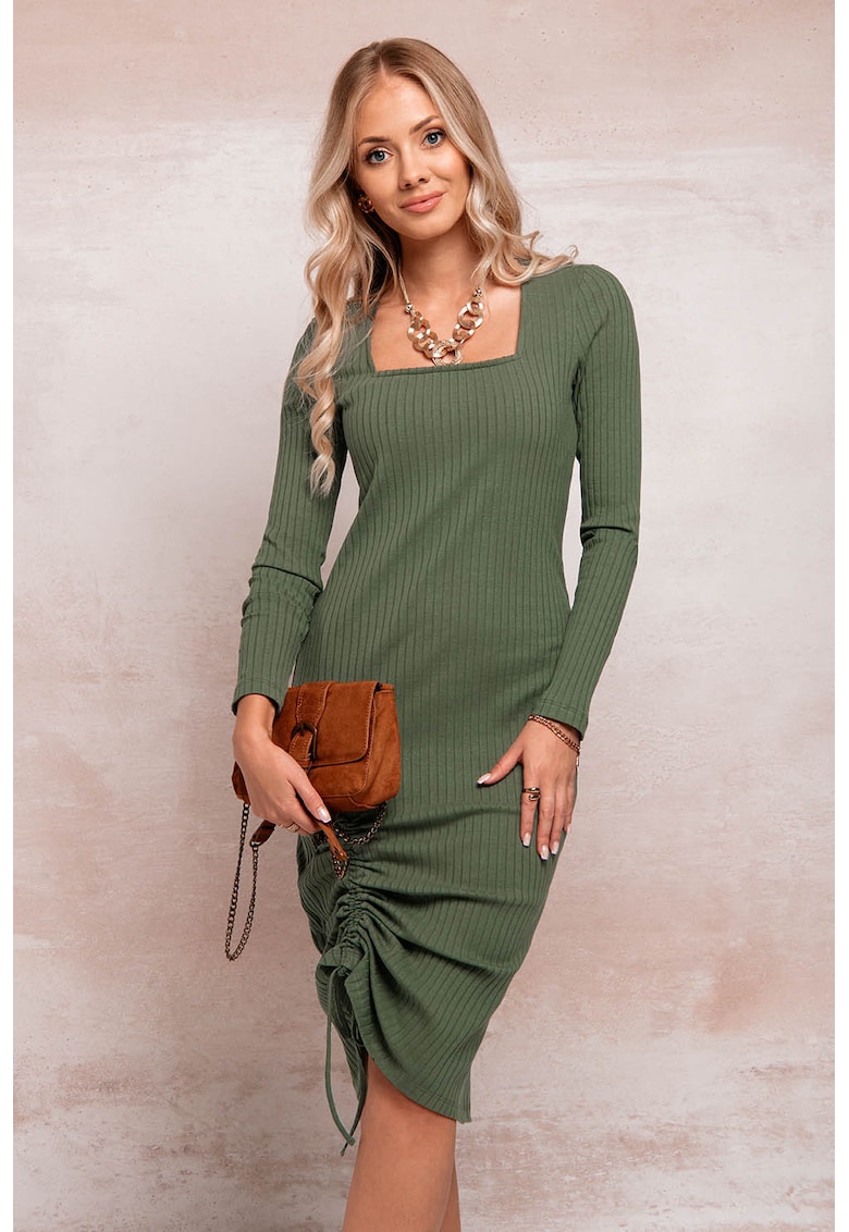 Caracteristici Culoare: kaki Stil: casual Material: bumbac Imprimeu: uni Croiala: bodycon Lungime: scurta Decolteu: patrat Lungime maneca: maneca lunga Detalii: aspect striat Sistem inchidere: fara inchidere Compozitie Exterior: 95% bumbac