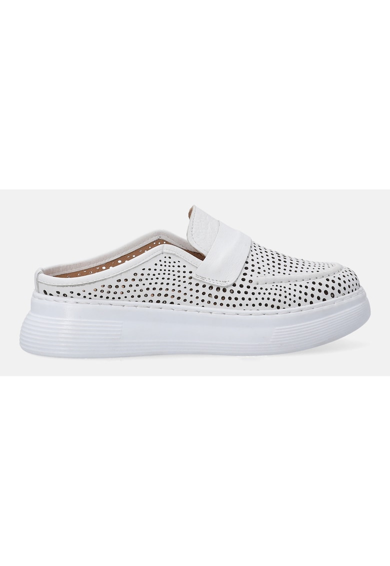 Caracteristici Tip produs: saboti Culoare: alb Material: piele naturala Stil: casual Imprimeu: uni Varf: rotund Tip talpa: wedge Compozitie Partea superioara: piele Material interior: textil Material talpa: 100% sintetic Dimensiuni Platforma spate: 4 cm