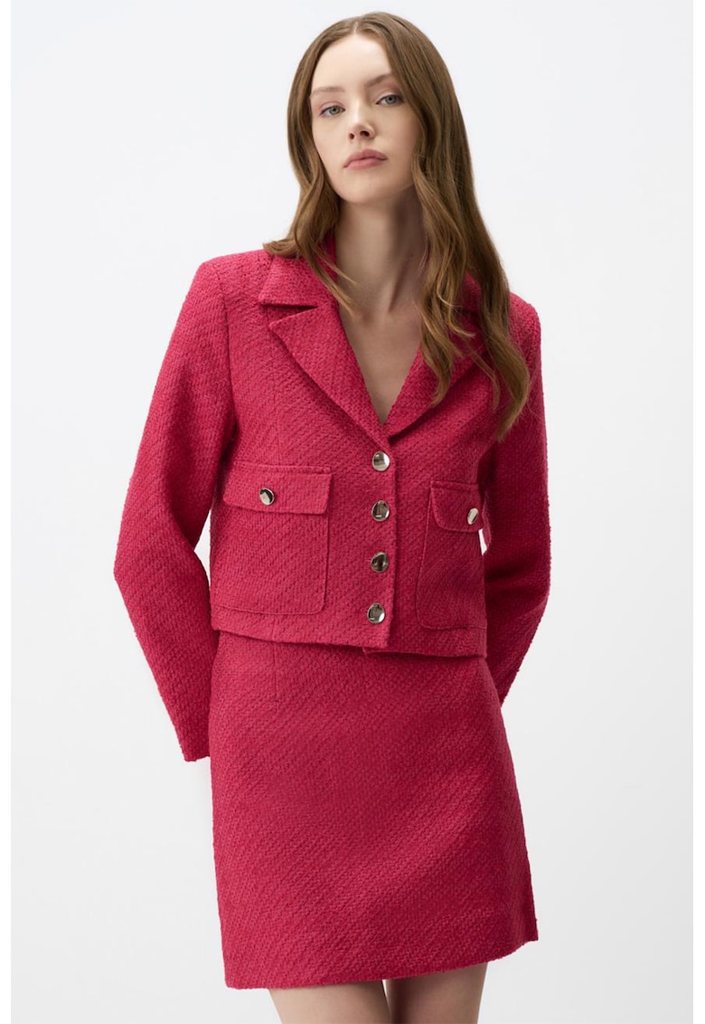 Caracteristici Culoare: fucsia Stil: elegant Croiala: crop Material: sintetic Imprimeu: uni Guler: cu revere Lungime maneca: maneca lunga Buzunare: cu clape cu nasture Detalii: slim fit Sistem inchidere: nasturi Compozitie Exterior: 75% acrilic