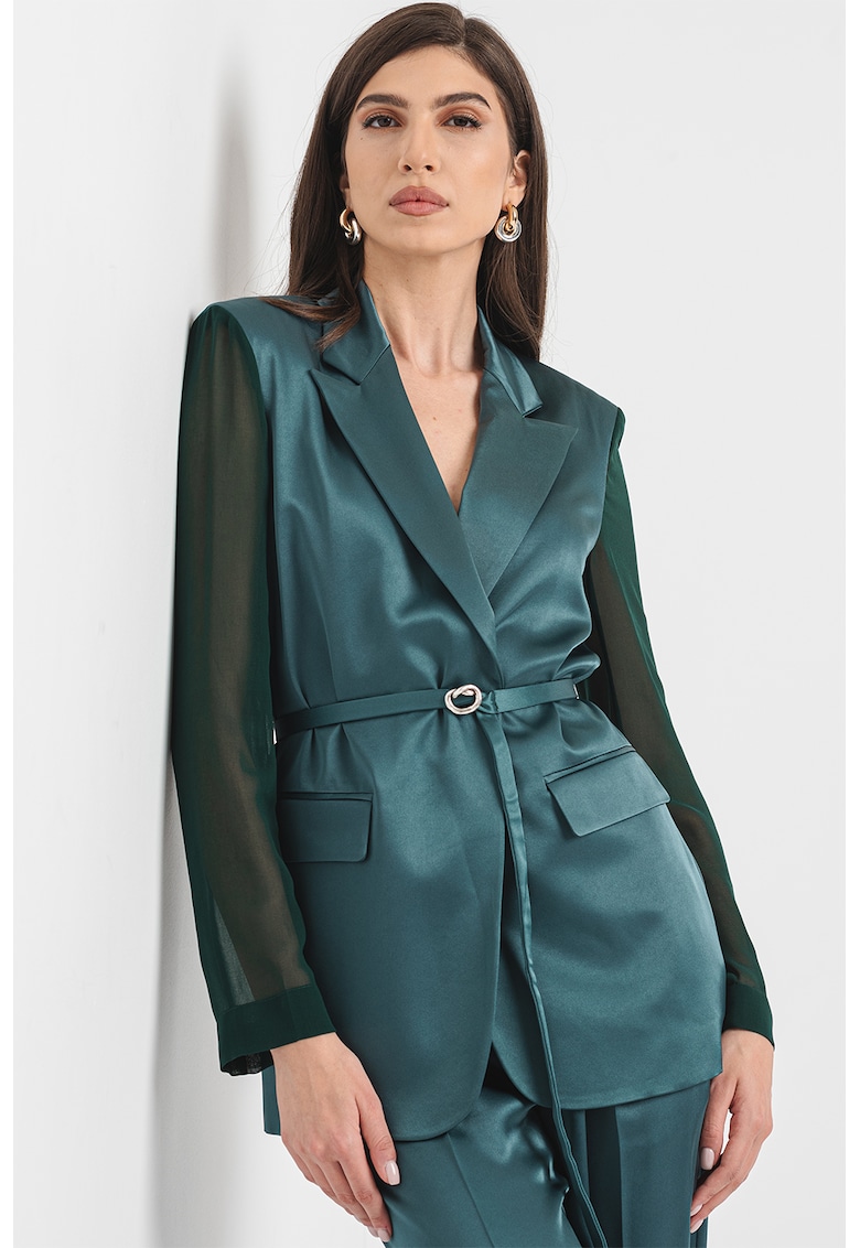 Caracteristici Culoare: verde englez Stil: elegant Croiala: regular fit Material: poliester Imprimeu: uni Guler: cu revere decupate Lungime maneca: maneca lunga Maneci: semitransparente Buzunare: 2 cu clapa Detalii: cordon in talie