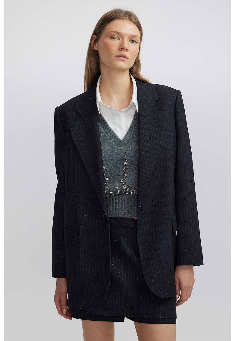 Caracteristici Culoare: negru Stil: casual Croiala: regular fit Material: sintetic Imprimeu: dungi Guler: cu revere decupate Lungime maneca: maneca lunga Buzunare: 2 cu clapa Sistem inchidere: nasturi Compozitie Exterior: 70% poliester