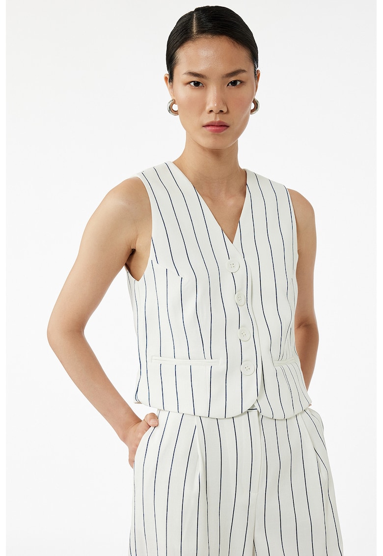 - viscoza Imprimeu: dungi Lungime maneca: fara maneca Sistem inchidere: nasturi Compozitie Exterior: 61% viscoza